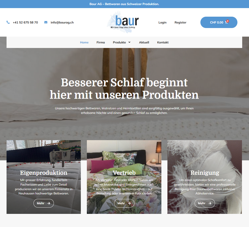 Für unseren Kunden Baur AG durften wir eine moderne, benutzerfreundliche und professionell strukturierte Website realisieren, die das hochwertige Sortiment an Bettwaren, Heimtextilien und Spezialreinigungs‑Service ansprechend präsentiert. Die neue Website unter baurag.ch wurde von Madex IT Solutions mit Fokus auf Übersichtlichkeit, einfacher Navigation und responsivem Design gestaltet – für ein starkes digitales Kundenerlebnis.