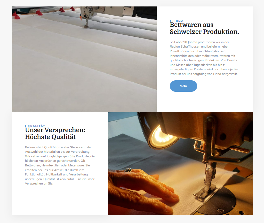 Die Website zeigt das vielfältige Angebot an hochwertigen Bettwaren und Heimtextilien, hergestellt in der Schweiz mit über 90 Jahren Erfahrung. Dazu gehören handgefertigte Duvets, Kissen, Tagesdecken, Masspolster und Molton‑Produkte, alle mit Liebe zum Detail gefertigt. Als Vertreter renommierter Marken bietet das Unternehmen zusätzlich Matratzen, Einlegerahmen und eine breite Palette an Heimtextilien – geordnet und verständlich dargestellt auf der Website.